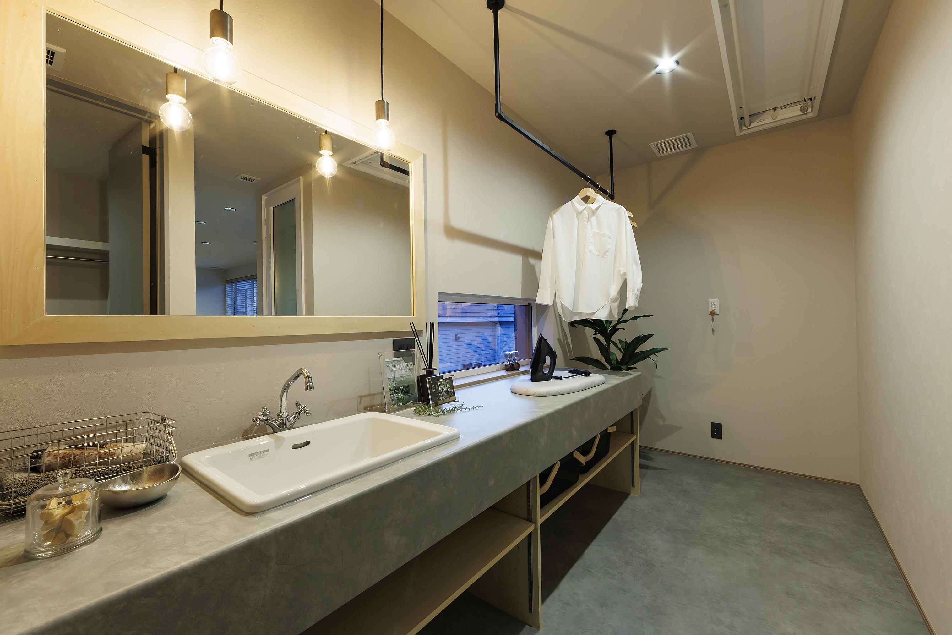 | 土間からつながる木の温もりと開放感たっぷりな広々とした26.4帖のLDK | 木とモルタルをイメージしたお洒落な洗面空間 |