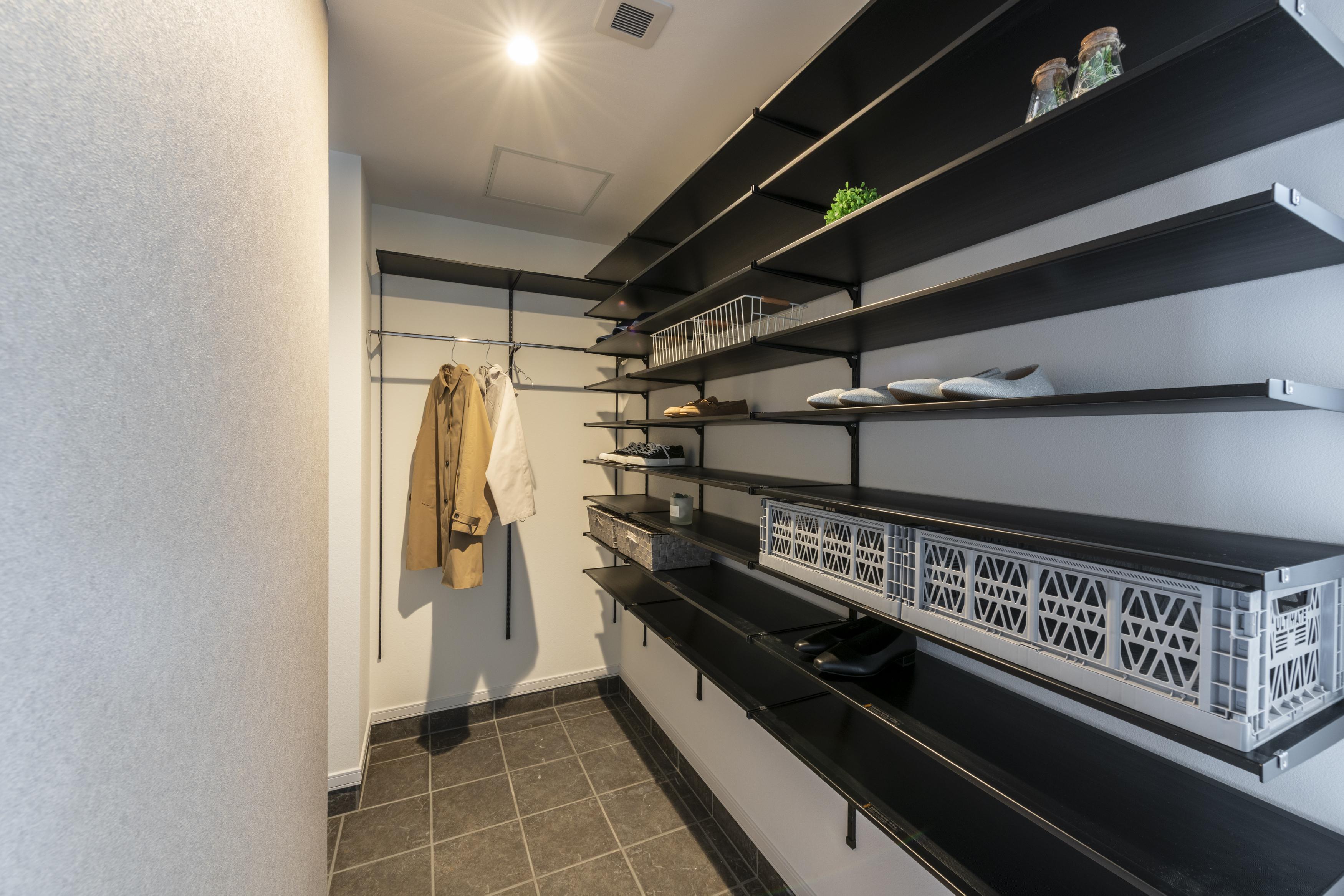 | 外観はシンプルで高級感を感じられるブラックのワントーンで統一 | たっぷりな収納でコートも掛けられるシューズクローク |