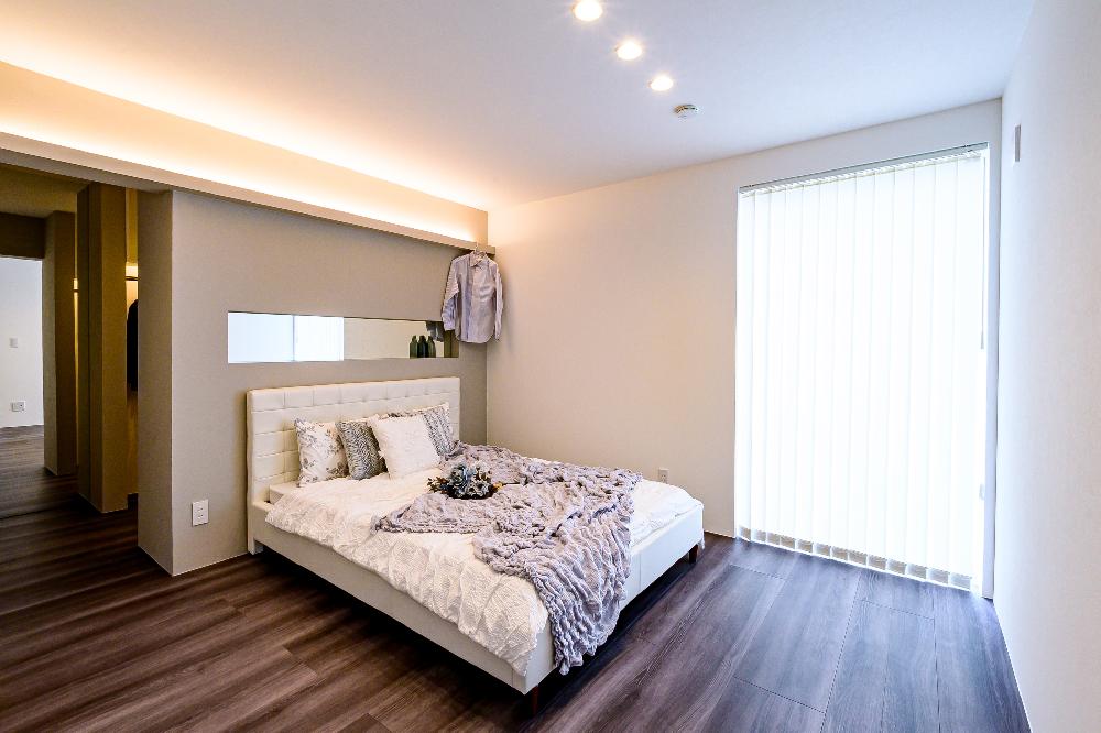 寝室も落ち着きのあるくすんだ色合いがよく使われており、 淡い色合いが、落ち着いた印象の中にも上品な雰囲気を醸し出してくれます