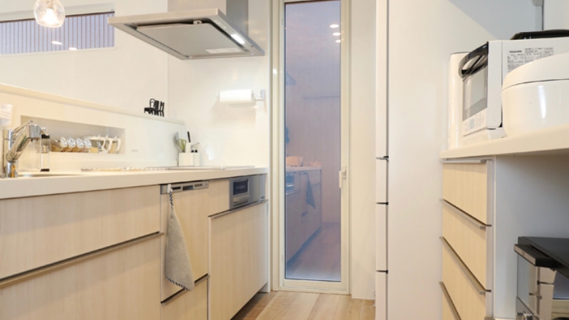 奥さまは特にキッチンまわりがお気に入り。食洗機の便利さはもちろん、勝手口があることで家事動線がとても良く、使いやすさを実感されています。細かな要望まで反映してもらえたうえに、しっかり予算内に収まり、大満足の住み心地だそうです。