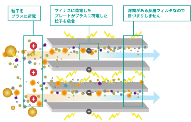 電子式集塵フィルターは、静電気の力を活用して空気中の微粒子を捕集します。