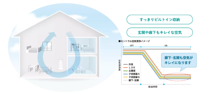 大風量で空調された空気を家全体に送り込み、各部屋や玄関、廊下、脱衣所などの空気を浄化します。