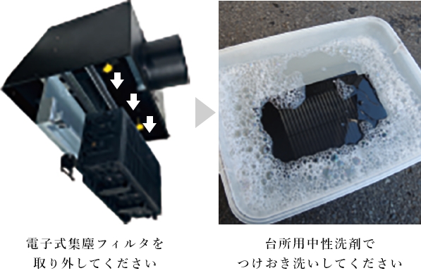 交換は不要です。電子式集塵フィルターは3か月に1回の水洗いで長期間使用できます。
