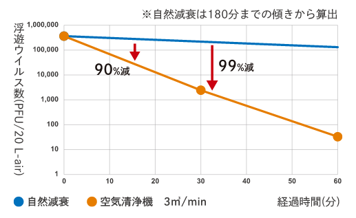 しかし電子式集塵フィルターなら、3分で⾃然減衰の90%以下、5分で99%以下に減少し、健康に有害なウイルスをすぐに除去することができます。