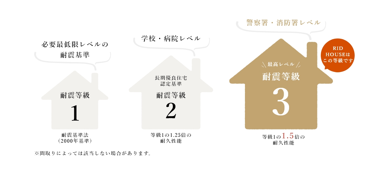 RID HOUSEの耐震等級は、警察署や消防署などの防災拠点と同じ、最高レベルの「耐震等級3」です。必要最低レベルの耐震基準である「耐震等級1」に比べ、1.5倍もの耐震性能を誇ります。