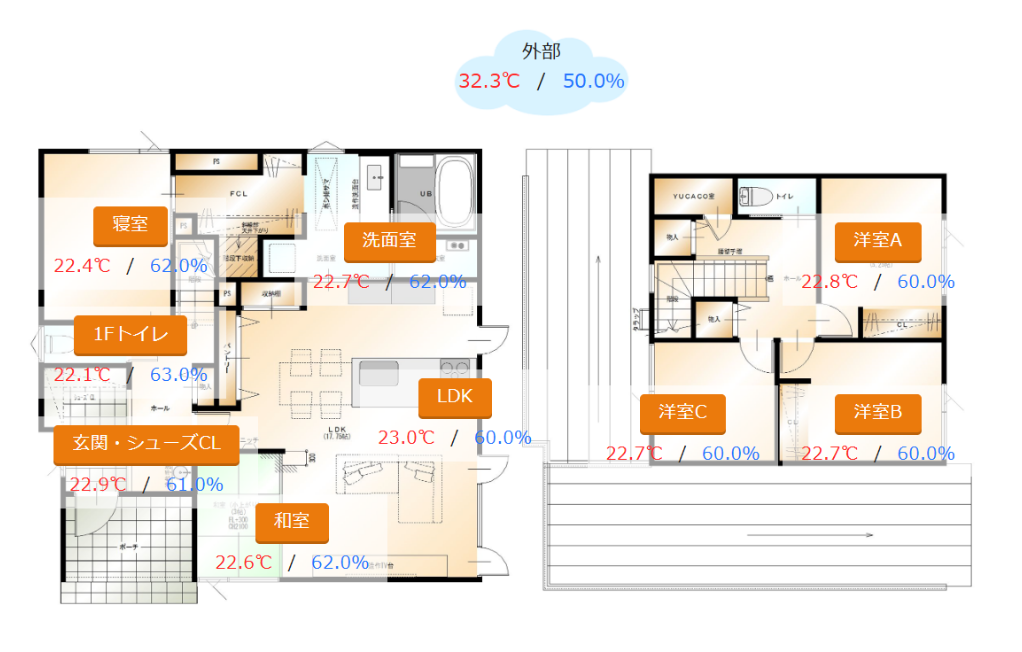 このようにUA値が極めて低い住宅では、外気温の影響を最小限に抑えて室内温度を安定させることが可能です。そのため、YUCACOシステムのような全館空調を導入した場合、家全体を効率よく冷暖房できる理想的な環境が叶います。