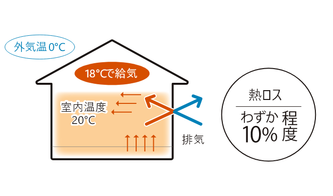 外気はそのまま取り込まず、熱交換ユニットで室温に近づけてから室内へ。約90%の熱を回収することで、省エネ性と快適性を両立します。