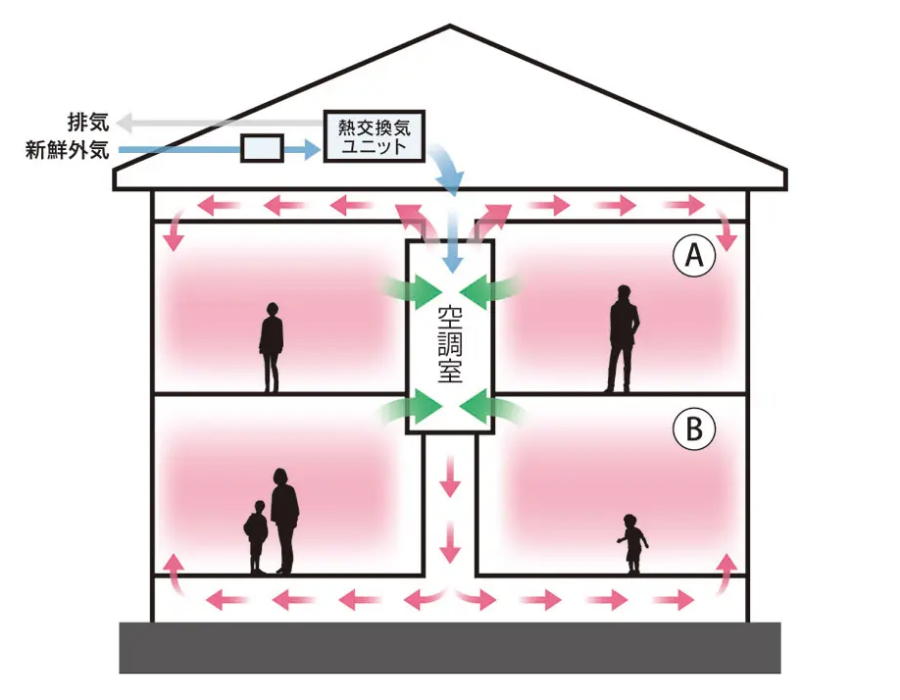 YUCACOシステムとは、家庭用エアコン1台で家全体の冷暖房をまかなう全館空調システムです。