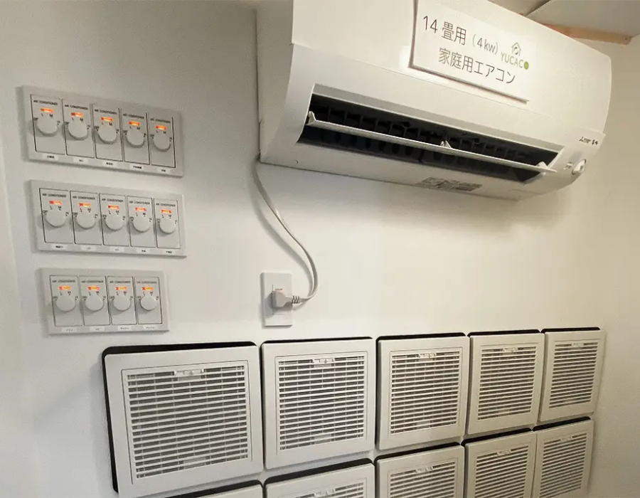 YUCACOシステムは、50年以上の使用を見据えて設計されており、耐久性の高い部材を厳選して構成されています。家庭用として広く流通しているエアコンや送風機、熱交換換気ユニットなどを採用しているため、万が一の際も必要な部品だけを交換でき、修理や更新のコストを抑えられます。