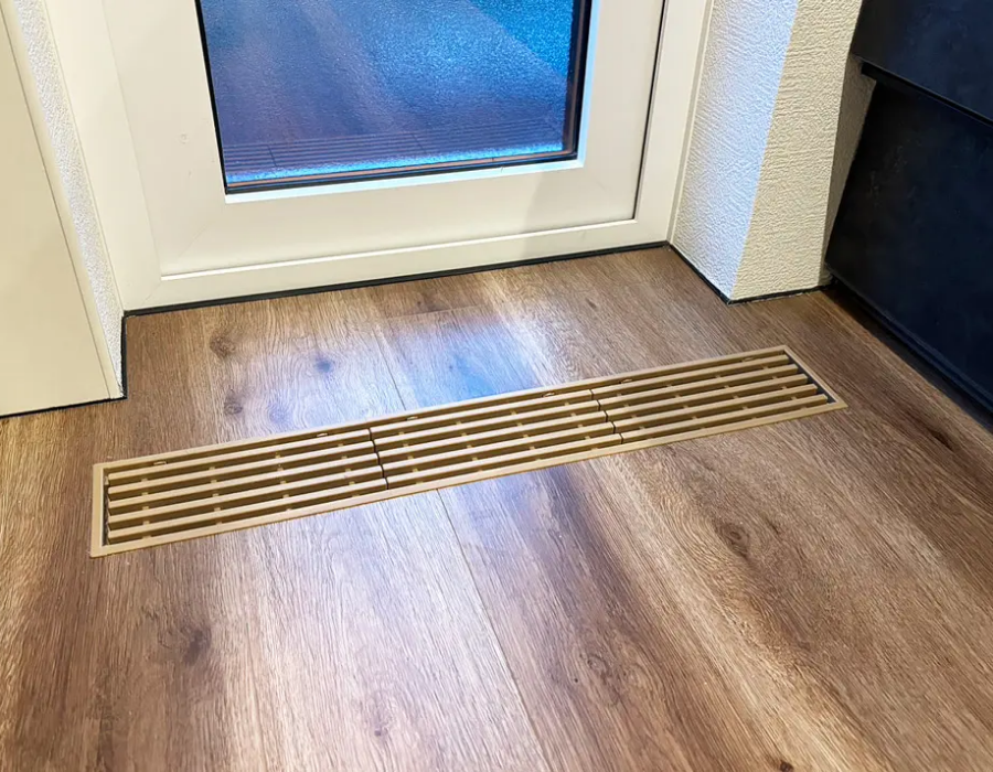 エアコンで調整された心地よい空気は、ダクトを通って各部屋へと運ばれ、給気グリルから室内へと流れ出します。1階では床のスリットから、2階では天井のフィルターから給気される設計で、空気は家中にまんべんなく行き渡ります。